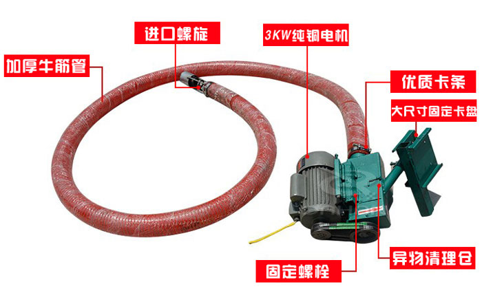 吸糧機(jī)是有螺(luó)旋管、螺旋葉片、機頭、機位、電機五部分(fèn)組成。