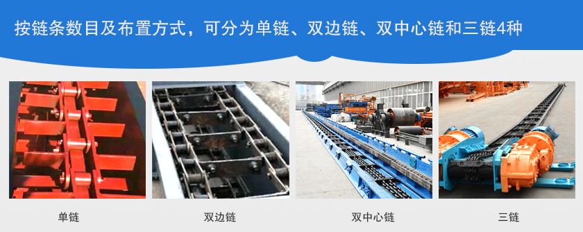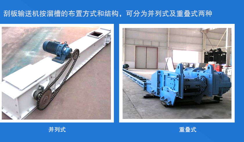 刮板輸(shū)送機(jī)按溜槽的布置方式和結構,可分為並列式及重疊式兩種,按鏈條數目(mù)及布置方式,可分為單鏈(liàn)、雙邊鏈(liàn)、雙中心鏈和三鏈4種。