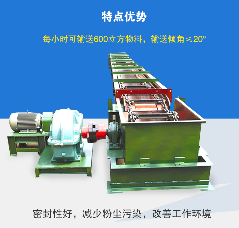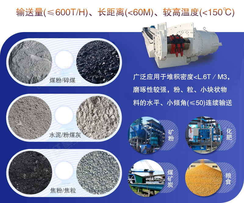 刮板輸送機(jī)廣泛(fàn)應用於堆積密度(dù)<l.6t/m3,磨琢性較強,粉、粒、小塊狀物料(liào)的水平、小傾角(≤50)連續輸(shū)送,如煤粉、碎煤、水泥、粉煤灰、焦粉、焦粒、礦粉、化肥、糧食等大輸(shū)送量(≤600t/h)、長距離(<60m)、較高溫度(<150℃)物料的連續輸送。