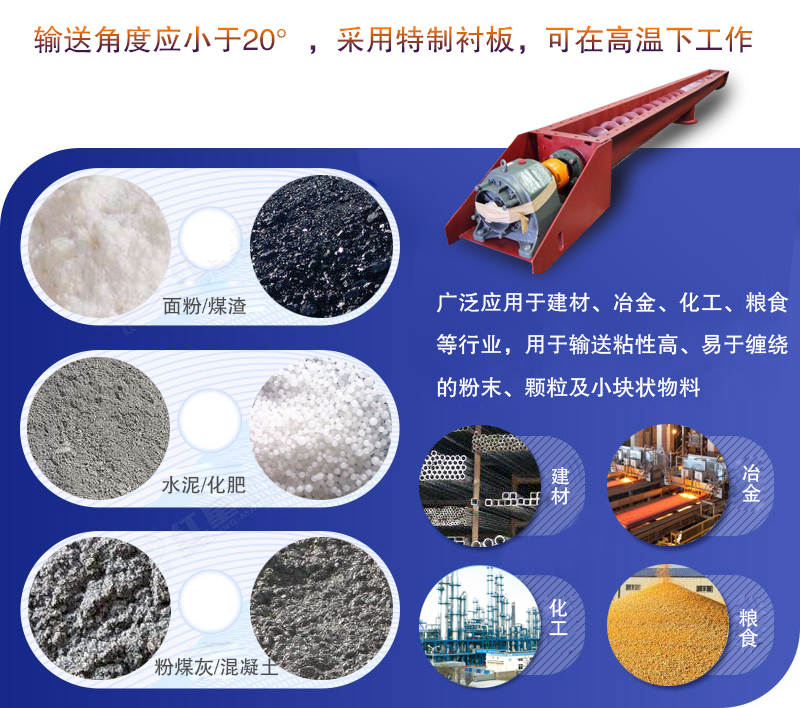 無軸(zhóu)螺旋輸送機廣泛應用於建材、冶金、化工、糧食(shí)等行業,用於(yú)輸送粘性高、易於纏繞(rào)的粉末、顆粒及小塊狀物料,其輸送角度應小於20°,采用特製襯板,可在高溫(wēn)下(xià)工(gōng)作。